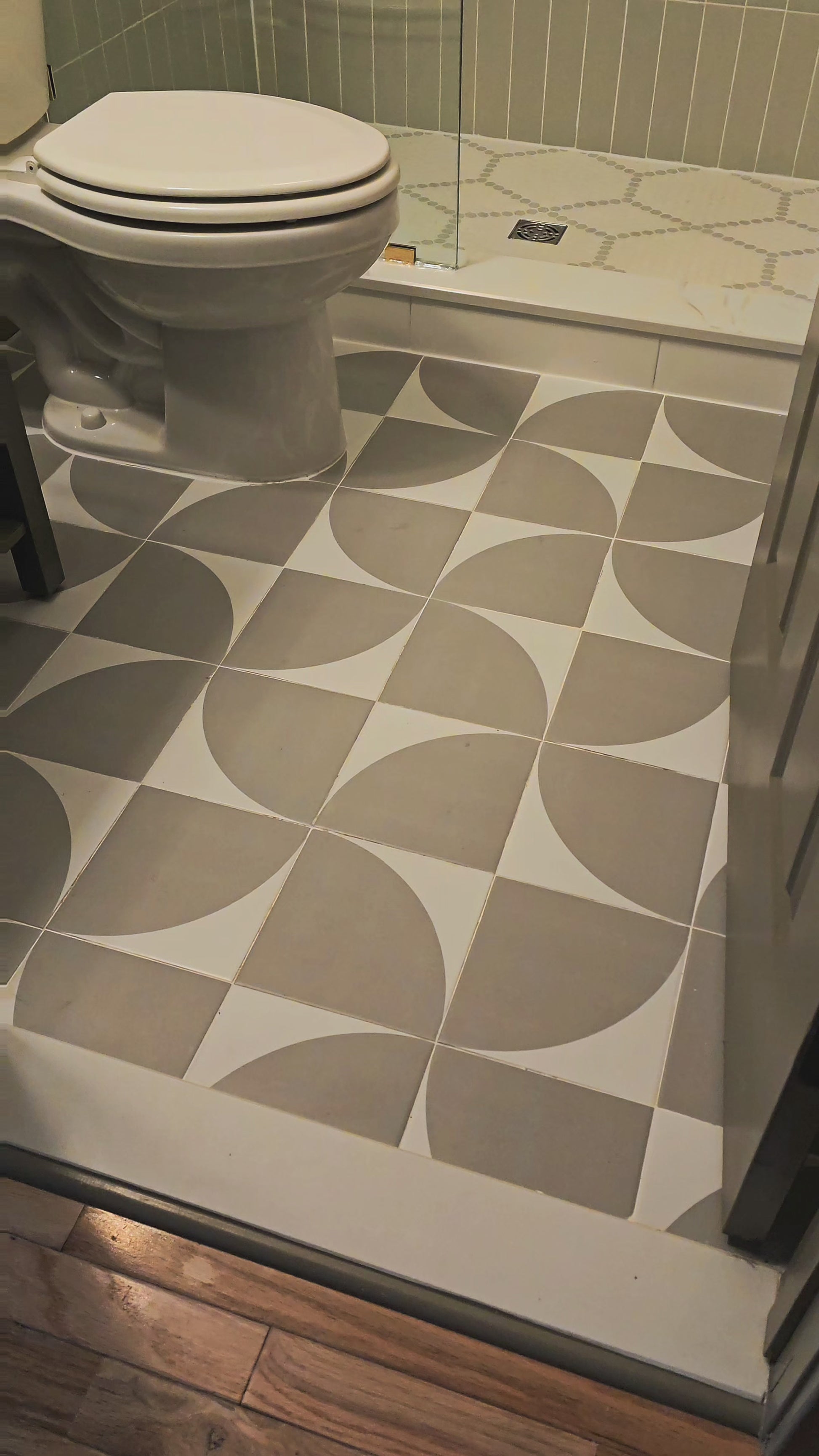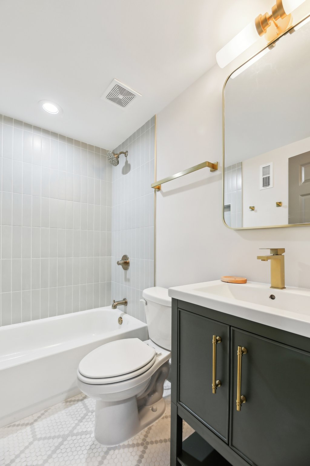 ✨️ The bathrooms? Oh, they’re like the life of the party—vibey mixes of green and gold that are a little bold but never too much. It's the perfect balance of calm with a pop of personality! The bathrooms stay in the same family with matching vanities and wall tiles, but the floors have a bit of fun, with the same color scheme in different patterns. And the powder room? It’s like that friend who’s always low-key but still has the best taste—neutral with a white vanity and gold accents. Totally non-confrontational, but still manages to make a statement!